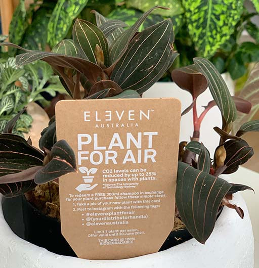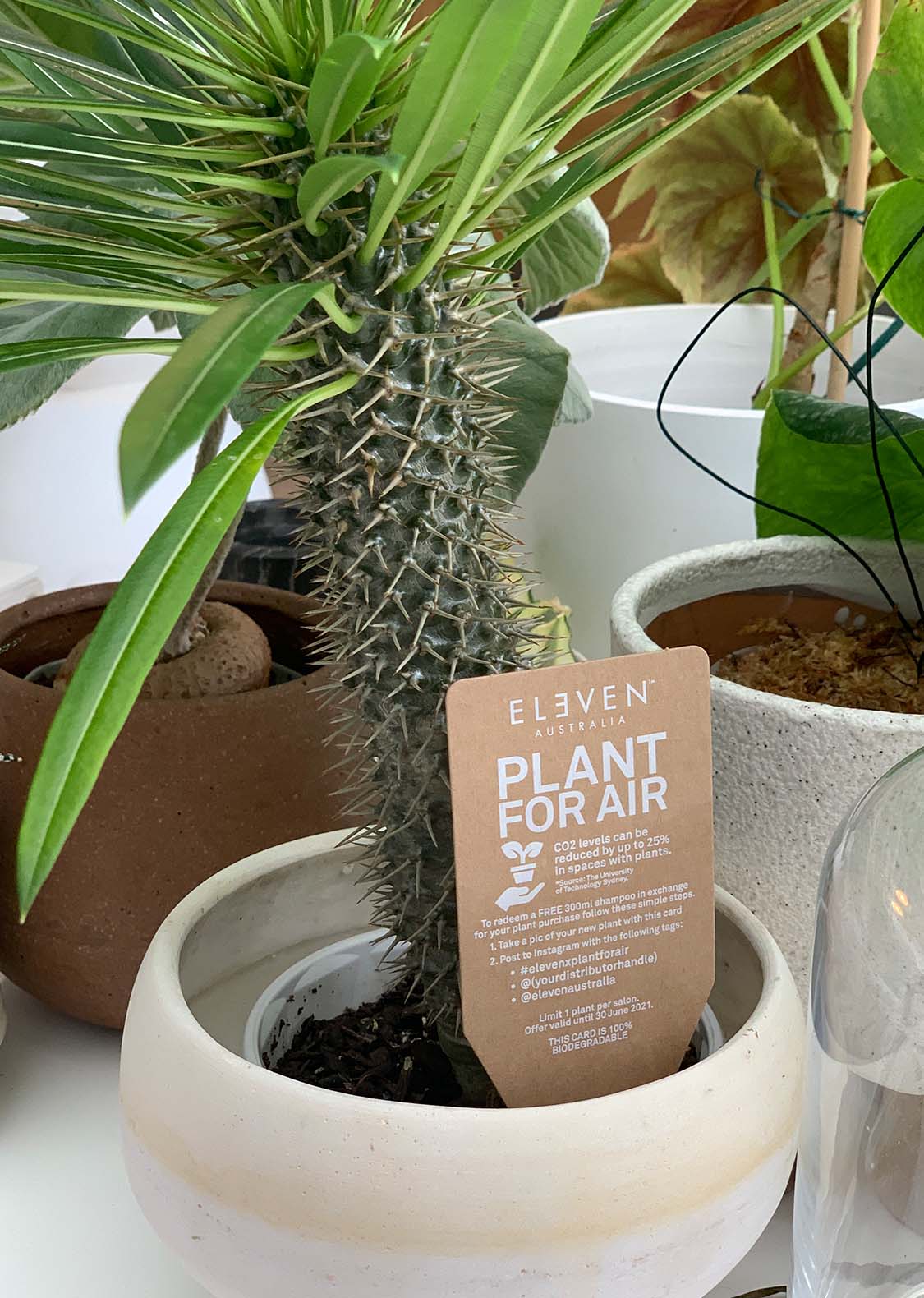 During the month of June, salons are given complimentary ELEVEN Australia x Plant For Air Cards and are encouraged to purchase a plant, post an image of it in their salon with the hashtag elevenxplantforair in exchange for a free full size bottle of shampoo. So in other words, the plant costs them nothing. This is a small investment with big feel-good potential for our salons and clients. Not to mention the positive impact this can make on the environment.